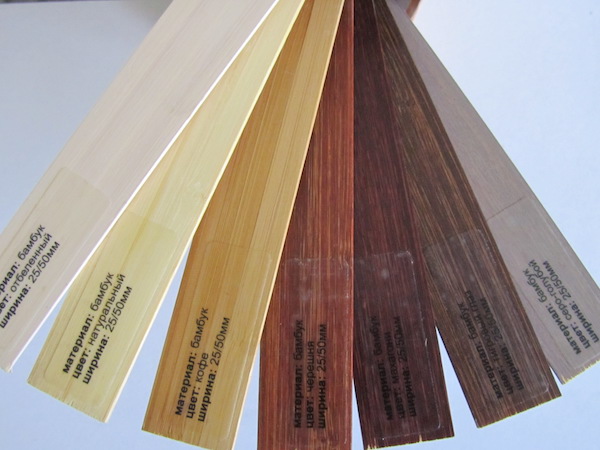 В качестве сырья для производства деревянных жалюзи используются специальные (сухие породы дерева)- древесина южноамериканской липы, так называемое дерево Basswood и Бамбук шириной полосы 25мм и 50мм. Ламели из бамбука тоньше дерева, а соответственно легче (это важно при монтаже прямо на створки окна) и в собранном виде занимают меньше места, чем деревянные. Бамбуковые жалюзи не боятся влаги, а поэтому возможна их установка в помещениях с повышенной влажностью воздуха, такие как ванные комнаты и бани, кухни.